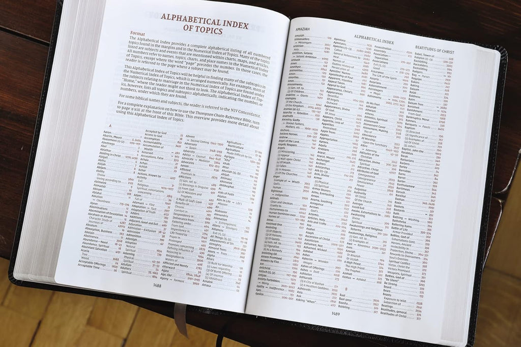 Beloved and acclaimed for more than five generations, the Thompson Chain-Reference® Bible is unparalleled in its ability to enrich personal devotions, topical study, and sermon preparation. This unique reference Bible enables you to search the breadth of Scripture’s teachings on thousands of topics and allows you to follow those topics throughout the entire Bible. With over 100,000 references, covering over 8,000 topics, the Chain-Reference System is an ideal tool for comprehensive topical study. The Thompson Chain-Reference Bible also offers a library of additional study resources that allows readers to interpret the Bible using related scripture passages rather than consulting a commentary.